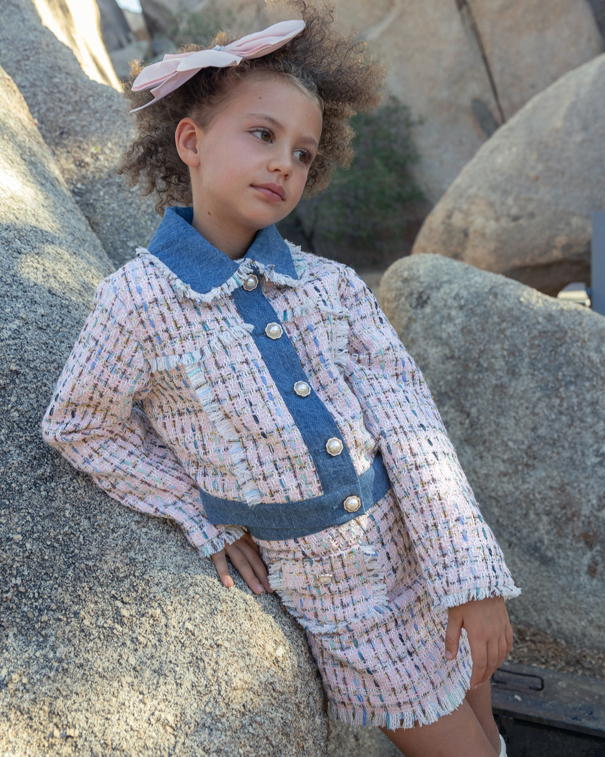 Step into standout style with the Texas Jacket in Pink Mix – a bold blend of texture, shimmer, and effortless charm. Crafted from luxe bouclé woven with lurex yarns, this eye-catching jacket adds a hint of sparkle to any outfit. Contrast denim details at the collar, placket, and hem provide a modern edge, while frayed pocket finishes bring a relaxed touch. Whether layered over a dress or paired with jeans, it’s a statement piece made to shine in every setting.